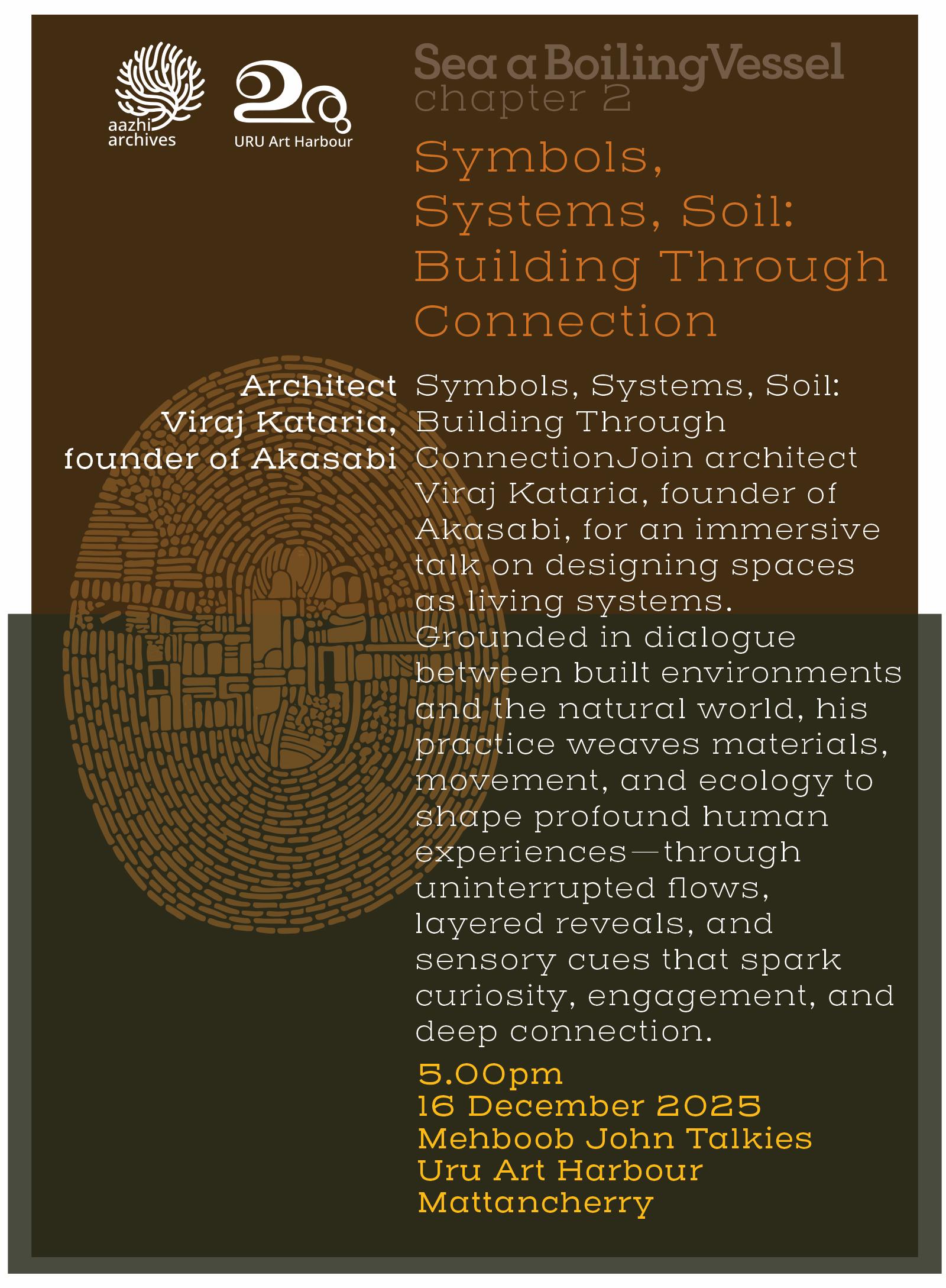 Like a creature rising from the depths after years underwater, the idea of Amphibian Aesthetics surfaced gradually. Its roots stretch across more than a decade of work in Kochi’s coastal neighbourhoods, beginning with projects that traced Kerala’s long and complex relationship with the Indian Ocean world. Among these formative explorations were the Mattancherry Project (2016) and the exhibition Sea a Boiling Vessel (2022), both of which turned our attention repeatedly toward water as the central medium of Kerala’s historical imagination.